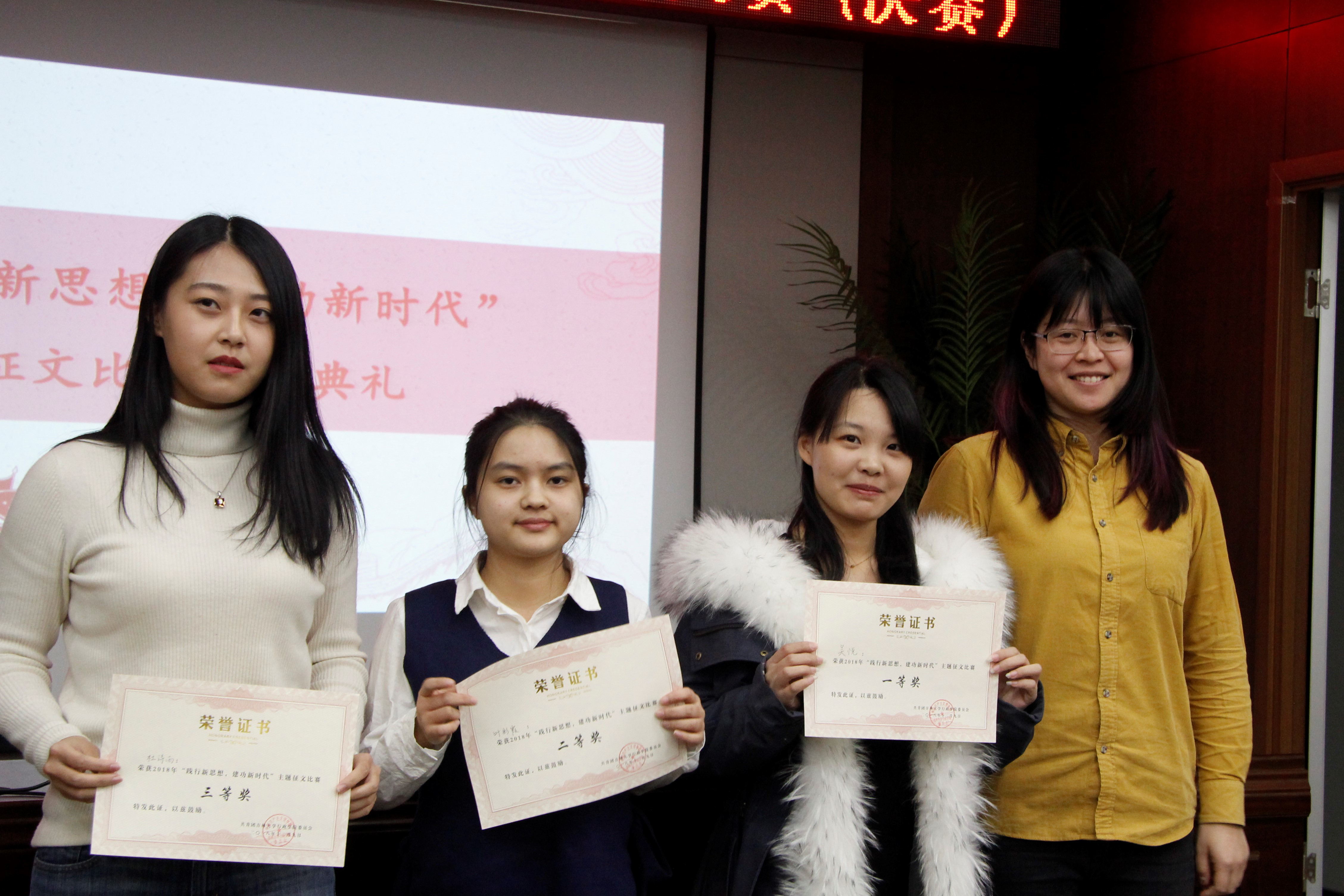 12月9日晚,共青团beat365委员会在东荣大厦B303室举办“践行新思想,建功新时代”主题征文比赛颁奖仪式。院团委书记曲畅竹分别为一等奖获得者吴悦(2018级本科生)、二等奖获得者叶彩霞(2017级本科生)及三等奖获得者杜诗雨(2017级本科生)颁发了荣誉证书。