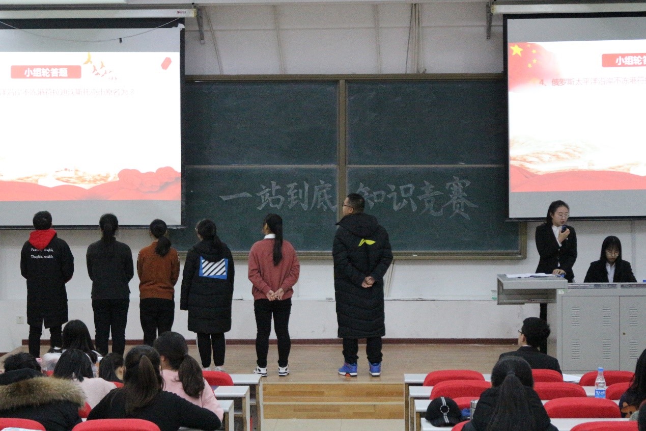 知识竞赛共分为小组轮答赛和附加选答赛两个环节。第一个环节包含文体娱、地理、历史、古典及政治学五类题型,由选手依次轮流作答,各组产生一名优胜者进入下一环节。在第二环节中,考察选手们对党团知识、校史院史的了解程度,选手可自主选题。整场比赛十分激烈又不失趣味性。本次知识竞赛既丰富了同学们的人文社科知识储备,又增强了班集体的凝聚力。