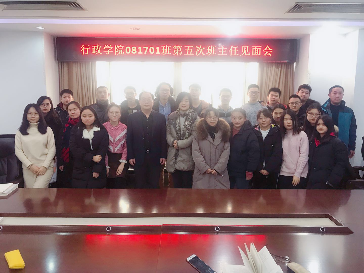 beat365081701班于12月21日上午在东荣大厦1214室举行了第五次班主任见面会,班主任老师张贤明教授、薛洁教授出席了本次见面会。班长孟从华同学担任此次见面会主持。