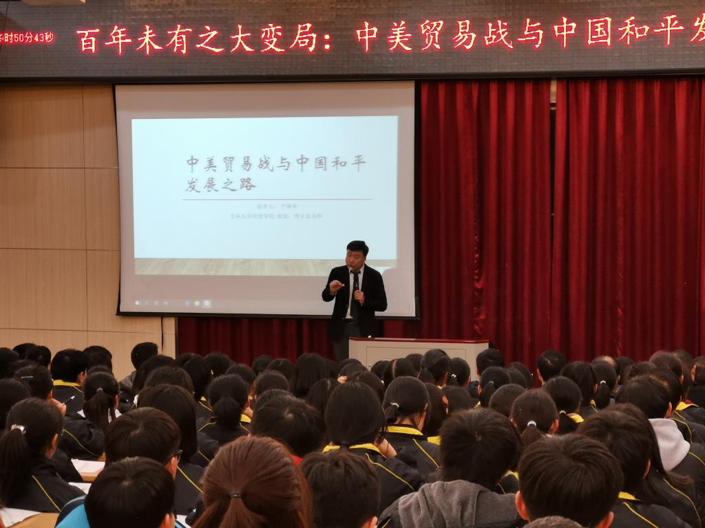 20日下午,公司一行来到湖北省十堰市郧阳中学。这是一所具有四百年历史的名校,是湖北省重点中学。于海洋教授、卢贵华老师与高中校领导进行了座谈,双方都希望有更多的优秀同学来到beat365体育官网读书,并就此加强相互间交流。座谈结束时,双方举行了“beat365体育官网优秀生源基地”授牌仪式。随后,于海洋教授在报告厅为200余名师生进行了beat365体育官网概述宣讲后,做了题为“百年未有之大变局:中美贸易战与中国和平发展之路”的专场学术报告。