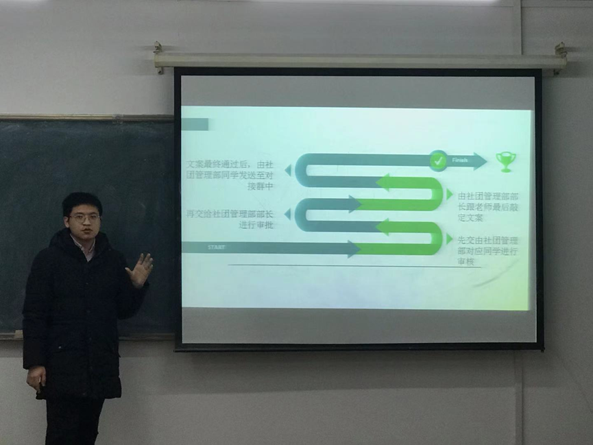 活动中,吕明轩就文案撰写、时效问题、流程问题三个部分展开具体培训,讲解了社团活动策划格式的规范标准,强调了社团审批过程中的时效问题,并通过列举社团活动的具体案例,明确了社团活动各项工作文件提交的时间期限。活动最后,各员工社团的相关工作人员就具体细节进行了提问。