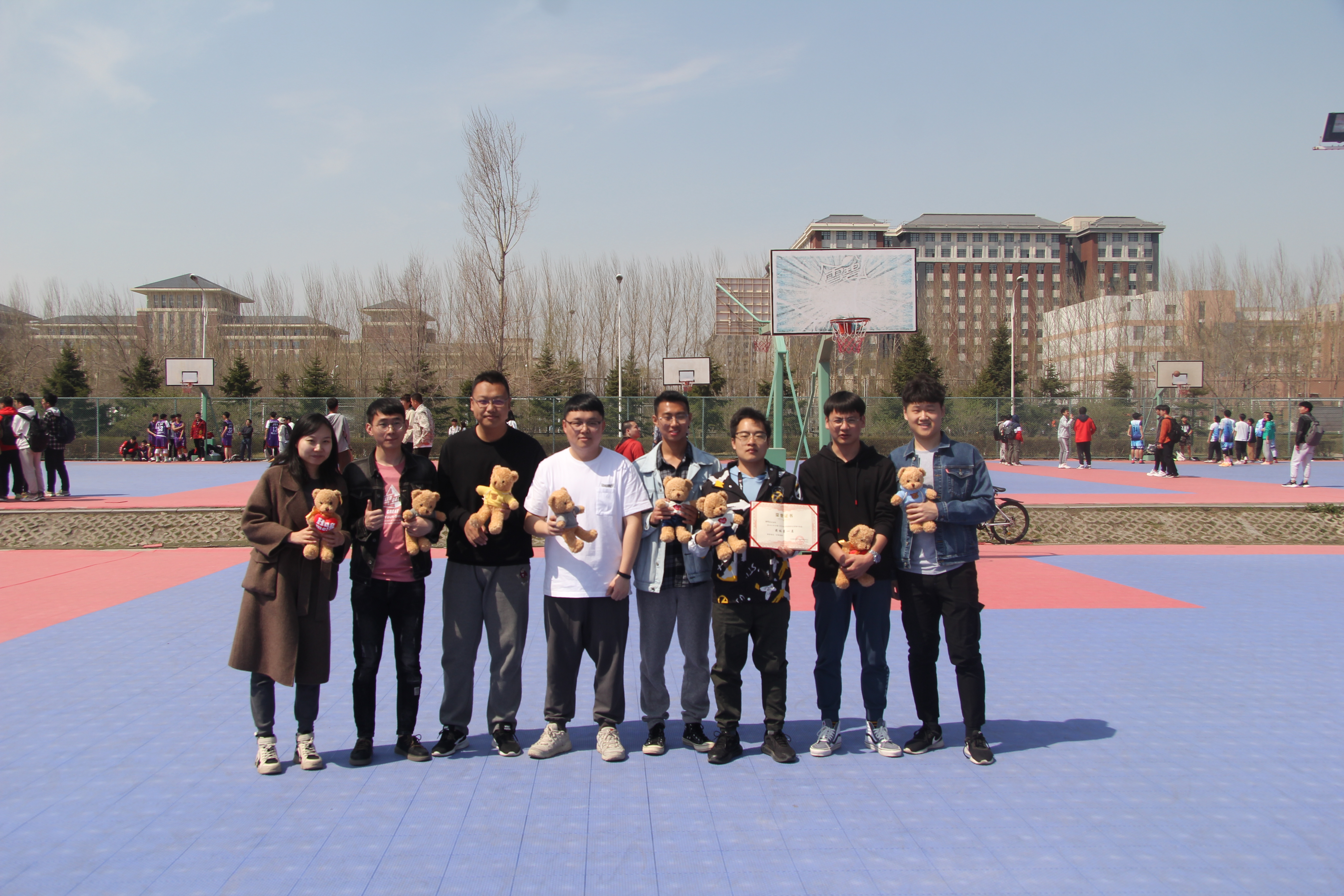 最后一个比赛日,进行了定点投篮比赛。男子组有5名同学和刘洋老师参与比赛,江禹熹(2019级本科生)获得第一名;女子组共有4名同学参加比赛,柴敏(2020级本科生)获得第一名。比赛结束后,高琛老师、刘洋老师和孙月老师为获奖队伍和个人颁奖并合影留念。