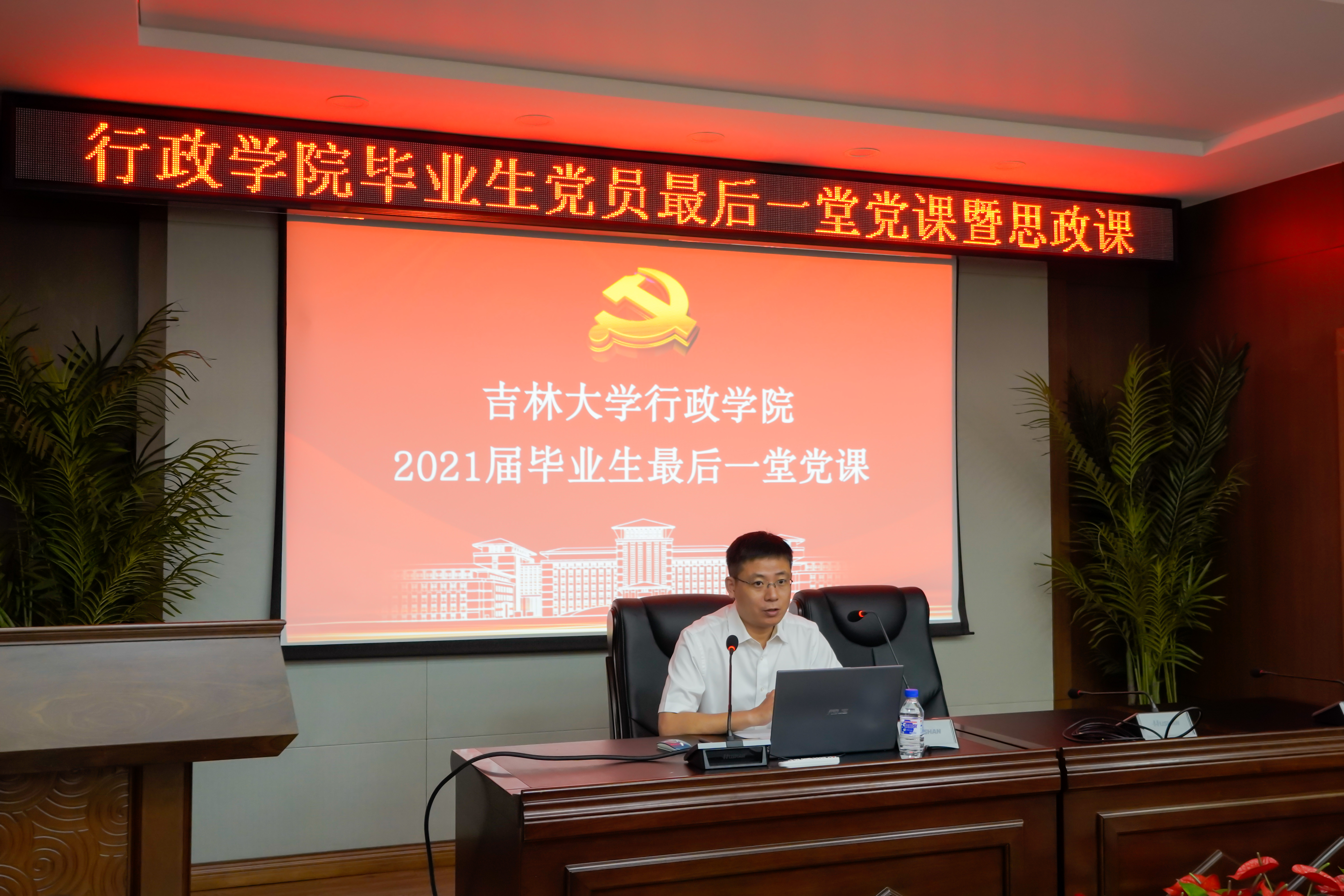 宣誓结束后,公司党委书记马景惠为全体毕业生党员讲授最后一堂党课。马景惠书记结合校史讲党史,以历史传承的校园文化和吉大精神为依托,通过诸多鲜活生动的实例,带领毕业生党员回顾了学校70余年改革发展过程中深沉厚重的鲜红底色、五湖四海的宽广胸襟、为国为民的家国情怀和砥砺前行的昂扬斗志,号召全体毕业生党员要继承和发扬优良传统,牢记习近平总书记对当代青年的嘱托和要求,牢固树立“四个意识“,坚定”四个自信“,坚决做到”两个维护“,在今后的学习和工作岗位上弘扬爱国精神、保持奋斗激情,建功立业新时代。对于即将面临人生重要转折的全体毕业生党员,马景惠对大家提出了三点期望:一是要牢记初心使命,坚定理想信念。以党性涵养情怀和提升品格,保持政治定力,恪守政治规矩,自觉做政治上的明白人、老实人;二是要坚持终身学习的强烈意愿。明确方向目标、掌握方式方法,以服务国家富强民族复兴人民幸福为己任,注重修身明理、坚持实事求是,不断强化理论武装和提升能力素养;三是锤炼持之以恒的耐心和韧劲。只争朝夕、直面挑战,敢于担当、勇于创新,在持续的拼搏奋斗中展现新时代青年的良好风貌,体现新时代青年的人生价值。