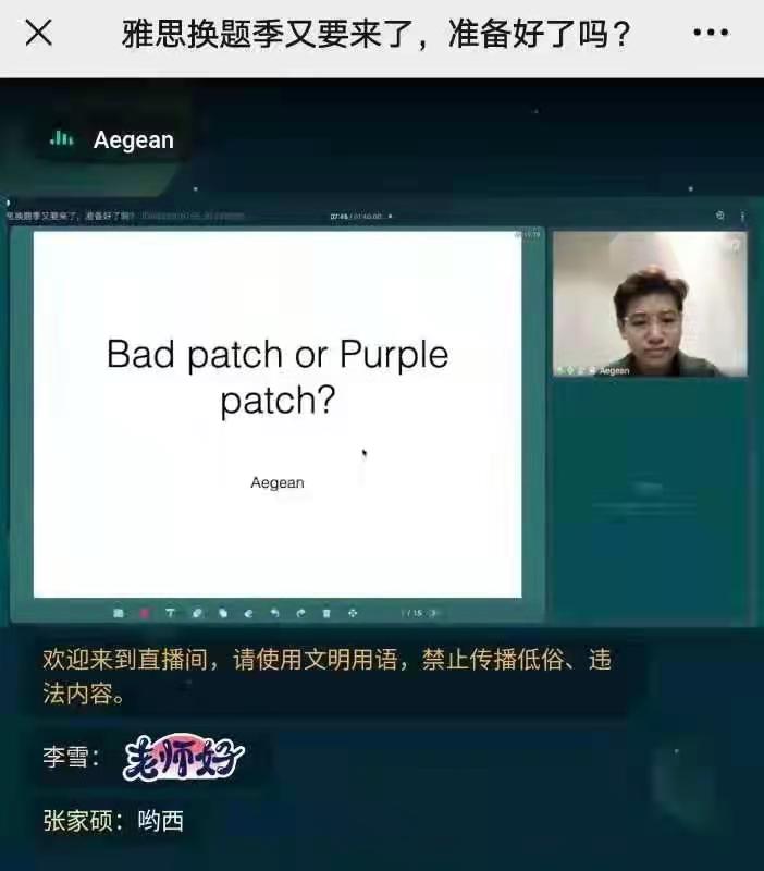 为应对即将到来的雅思口语换题季,帮助同学们更好备考雅思,进行针对性训练,进一步提升英语能力,beat365外语协会特邀请资深口语教师Aegean于8月21日上午在线上举办了“雅思口语换题季”专题讲座。