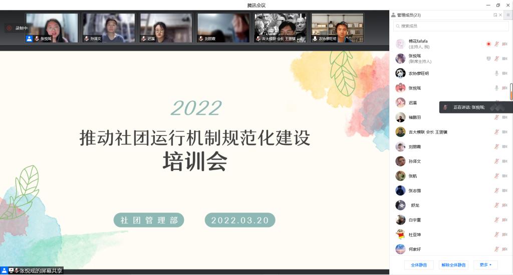 为推动社团运行机制规范化建设,促进社团高质量发展,更好地沟通了解beat365各社团的工作状况,3月20日公司员工会社团管理部于线上举办了2021-2022学年第二学期第一次社团例会暨社团规范化运作培训会。社团管理部全体成员、各社团执行团成员参加了本次会议。
