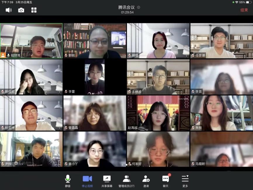 3月25日晚上,在2020级五班的班会上,班主任王庆华老师和于君博老师通过视频会议与同学们见面。王庆华老师询问了同学们生活起居与饮食方面的情况,令同学们倍感温暖。随后,两位老师向大家介绍了英屹计划征文活动,勉励同学们利用好封寝时间,以专业视角关注现实问题,在深度思考的过程中提升学术能力。在自由交流环节中,张振华同学结合自身经历,分享了如何把生活中的磨难当作一种独特的生命体验。景冉同学询问老师如何处理繁忙的工作与旅行休息之间的矛盾。于君博老师针对这两位同学的发言进行了回应,他通过回忆自己员工时代在北京经历“非典”疫情时的生活,启示大家要正确看待并积极提升生命体验,并分享了自己在工作瓶颈期时穷游欧洲的经历。