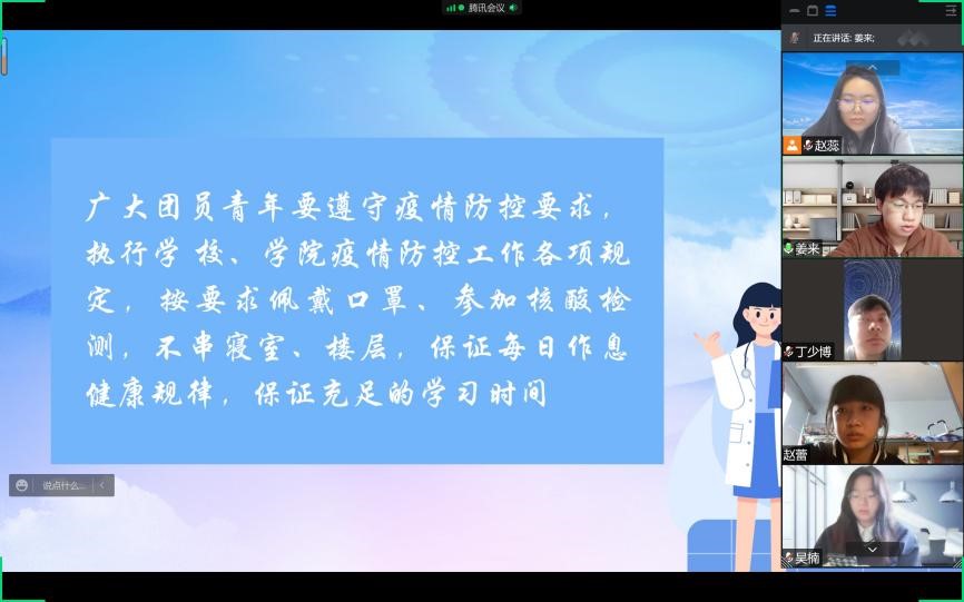 本次团日活动以腾讯会议的形式开展,整体分为学习解读、分享感悟、总结收获三个环节。活动伊始,各班团支书带领大家认真学习了本月理论材料,并结合教育部近期颁布的教学文件与自身经历进行讲解,使同学们更好地了解到党中央对防控疫情的坚定信心,对民生的真实关切,对部署工作的严谨思虑,同时还加深了同学们对现有校园疫情防控政策的理解。随后,同学们结合身边的抗疫事迹积极分享自己的感悟,梁恩昊(2019级本科生)从自身预备党员的身份着手,分享了自己担任宿舍楼志愿者的心得感悟,表示自己的党性修养在疫情防控的志愿服务实践中得到了锻炼提高;周密(2019级本科生)从疫情期间老员工心理健康问题出发,鼓励同学们正确处理焦虑、抑郁情绪,通过学习,运动,心理咨询等方式调节自身心理状况,以积极心态迎接困难;贺洋(2019级本科生)分享了封寝期间教师和其他学校工作人员以及志愿者所展开的具体工作,鼓励大家坚持防疫、做好相关的自我防护。最后,各班团支书归纳总结了同学们的发言,号召全体团员坚定抗疫必胜的信心,践行“同心战‘疫’,请党放心”的青春誓言。