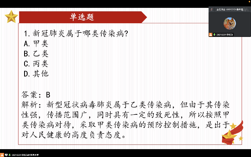 本次团日活动于线上展开,各班团支部通过理论知识讲解,感悟交流分享,防疫知识比拼三个环节对中央政治局常务委员会贯彻执行全国人民代表大会防控疫情方针召开的会议进行深入解读与学习。首先,各班团支书为支部成员详细介绍了会议召开背景及会议具体内容,着重学习党中央对疫情发展形势的最新研判,分析了“动态清零”防疫政策的科学性和严谨性,端正了团员青年的抗疫心态。接下来,全体同学以理论学习材料为基础,学习了2022 年第4次全国教育系统疫情防控工作视频调度会议精神,强调教育系统内部疫情防控的重要性。在两项学习内容结束后,同学们热烈交流讨论,分享自己的学习收获与观点看法。郭长平(2021级本科生)表示经过此次学习,对疫情的认识上升到了更加广阔的全局性视角上,对疫情防控的各项部署也表示由衷的认可和支持;于淼(2021级本科生)结合了自己在疫情期间报名公寓志愿者的经历,表达了自己的信心决心,认为此次抗疫期间我国的疫情防控保持着全球领先的地位,充分彰显了中国共产党领导和我国社会主义制度的显著优势。刘雪莹(2021级本科生)则聚焦身边抗疫的“小角色”——寝室长,表达了“奉献者,角色无大小”的观念,以此表达对身边每一位默默贡献抗疫力量的同学和工作人员的感谢。