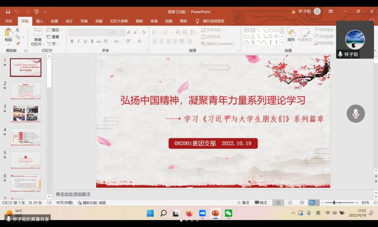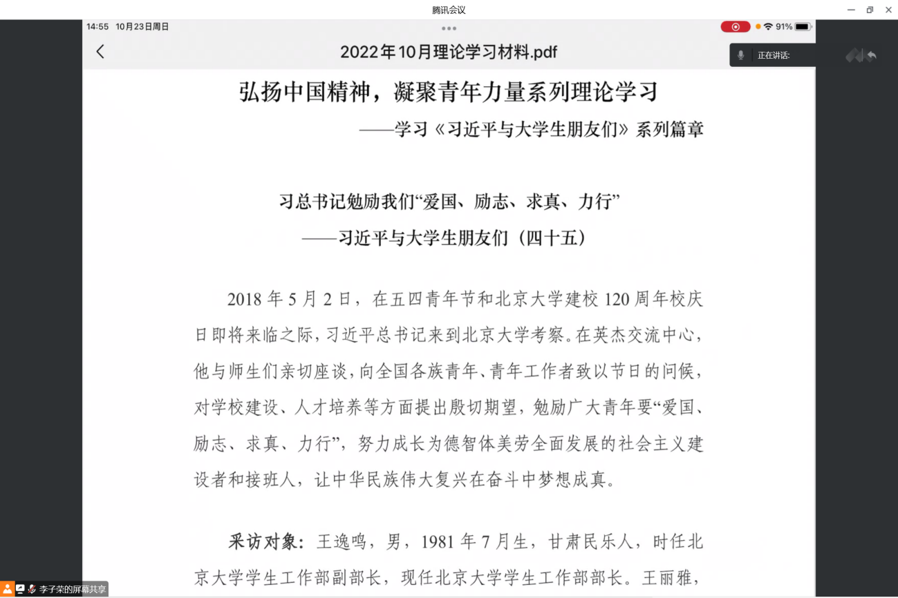 《习近平与老员工朋友们》收录了习近平同志自工作以来与老员工们交往、交流、交心的故事,是新时代青年工作的鲜活教材,其中第四十五篇主要围绕习近平总书记于北京大学120周年校庆与五四青年节到临之际与北京大学师生的座谈内容展开。为深入学习贯彻落实习近平总书记关于青年工作的重要论述,在院团委的指导下,beat3652020级各班团支部开展了“弘扬中国精神,凝聚青年力量”主题团日活动。