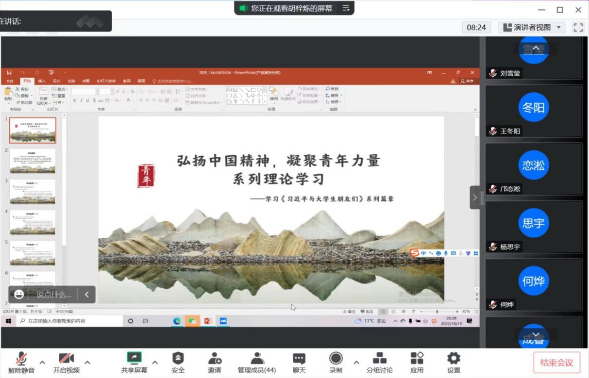 第三部分,感悟分享环节。姚楠(2021级本科生)发表感言:“每一名团员青年都应该时刻牢记习近平总书记嘱托,‘爱国、励志、求真、力行’不仅是一句口号,更要落到实处,成为新时代青年的行动指南。”黄琴(2021级本科生)指出:“青年兴、则国兴,青年强、则国强。青年一代有理想、有本事、有希望,国家就有前途,民族就有希望,青春之我和强盛之国紧密相连、密不可分。”最后各班团支书进行总结讲话,大家一致认为,时代总是把历史责任赋予青年,青年要为建设社会主义现代化强国不懈奋斗。