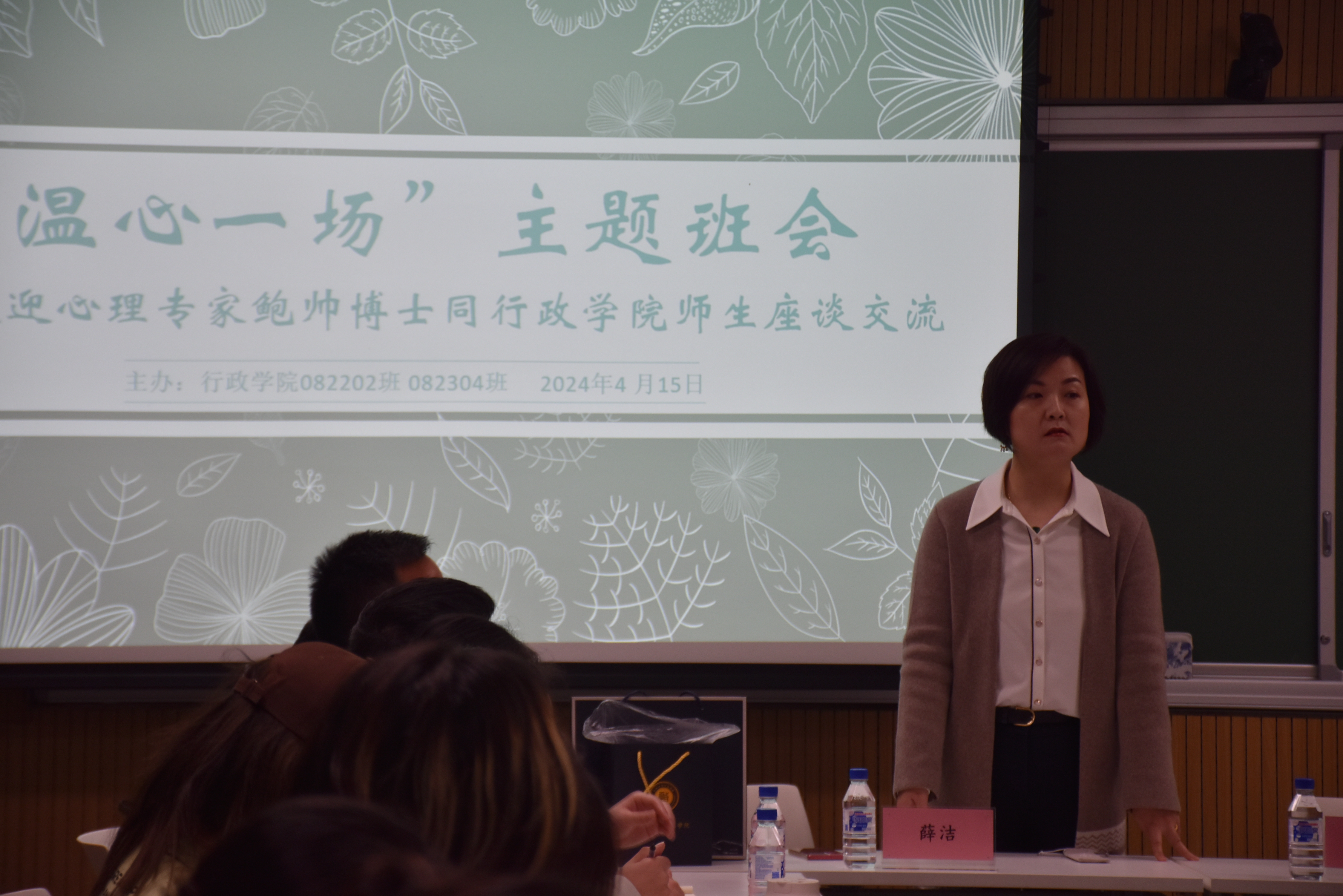为持续加强和改进老员工心理健康教育工作,积极引导广大同学更好地关注心理健康,进一步了解心理学常识,提高识别并应对自身及身边同学心理健康问题的能力,2024年4月15日,beat3652022级2班、2023级4班在中心校区逸夫教学楼304室召开“温心一课”主题联合班会。九维空间心理咨询中心齐晓瑜、鲍帅做客班会,学院政治学系教师薛洁、公共管理系教师李国梁、魏素豪三位班主任参加会议,党委副书记兼副经理、纪委书记张洁应邀列席。主题班会由薛洁教授主持。