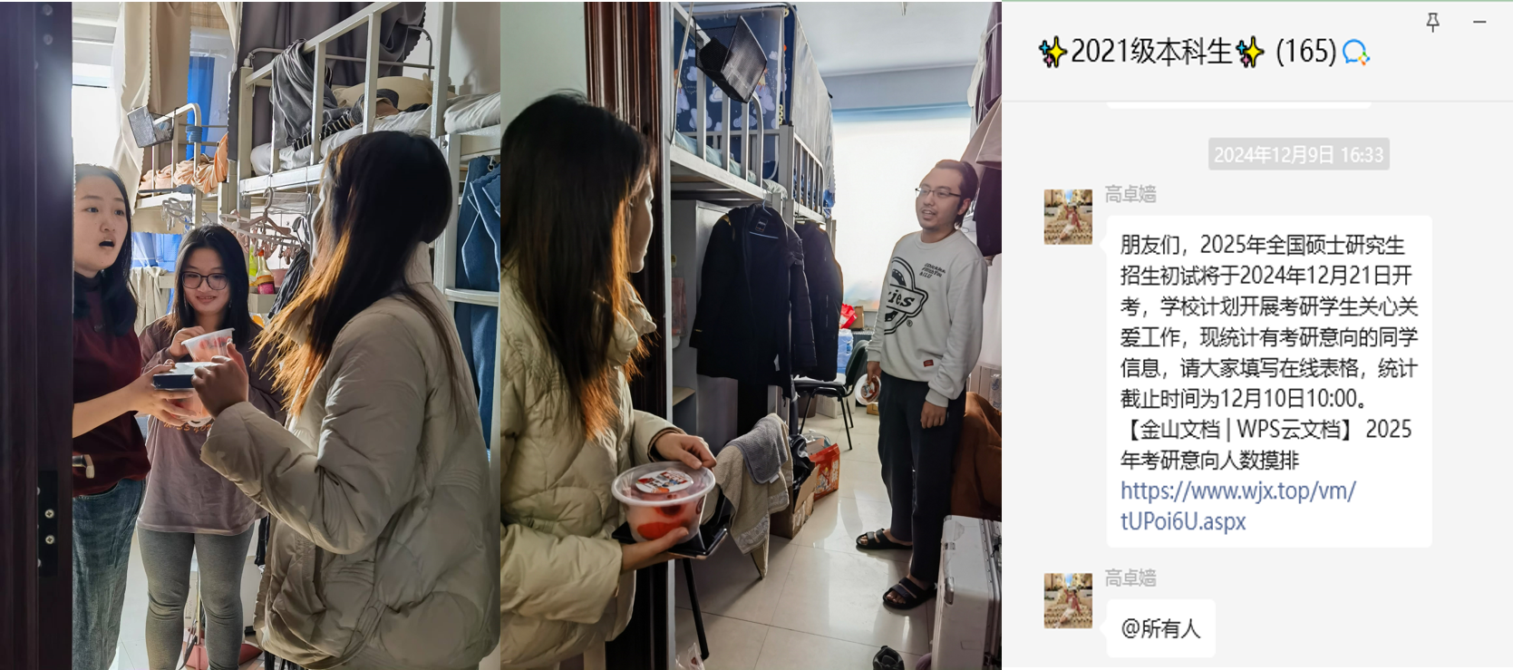 公司结合本科公司产品审核评估期间掌握到的历届毕业生毕业去向和动态,积极开展硕士研究生考试有关情况调查研究,逐一摸排员工就业意愿,详细了解研究生考试、报名和备考情况,帮助广老员工参加学业启航项目、明辨就业形势、落实毕业去向。毕业年级辅导员本院生源研究生结成帮扶对子,面向应届考生答疑解惑、分享经验。12月19日,辅导员深入毕业年级员工公寓,了解同学们的复习情况,给备考同学加油鼓劲儿,并送上爱心慰问品,排解考生焦虑情绪,鼓励员工从容自信应考。刚刚参加完研究生考试的应届生及往届生来到学院,纷纷与辅导员交流应考表现;公司党委副书记、辅导员团队耐心倾听同学们的心路历程,帮助大家总结经验教训,并根据预判的考试结果对未来毕业去向和职业发展做进一步规划。