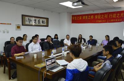 座谈会中,首先由主持人王阳愉介绍到场嘉宾,随后杂志社现任社长求是对杂志社近年来的新发展进行了简单的介绍,并展示了自1996年创刊至今的杂志照片和杂志社宣传片。接下来颜德如老师和张丹竹老师共同讲述了创刊初期的故事。在他们的回忆中,有创刊的初衷,有取名的趣事,有学院的支持,更有王惠岩老先生题写杂志名称时的细致与不苟。陈松、刘洋和张力伟也讲述了杂志社发展过程中的故事。因公未能到场的院友吴滨在微信上表达了对杂志社的怀念和美好祝福。在接下来的畅谈中,颜德如教授在如何办刊、如何提高杂志社影响力等方面提出了建议,他指出要结合互联网平台来发展刊物,要通过邀请名家大家开讲座的方式提高杂志社影响力,将《行政之光》推广到学校甚至是其他高校。最后,工作人员向到场嘉宾发放《行政之光》纪念品并合影留念。