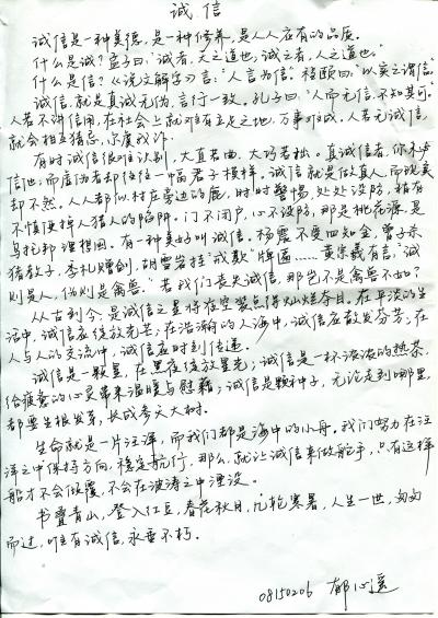 通过这次诚信格言(硬笔)比赛,使同学们接受了中华传统诚信文化的熏陶,帮助同学们树立了正确的人生观、价值观。同时,本次活动还号召员工们自我教育、自我完善和自觉加强诚信建设,牢固树立诚信为本、操守为重、守信光荣、失信可耻的信用意识和道德观念,从而促进员工们潜能的发挥,展现新时代优秀老员工的诚信形象。
