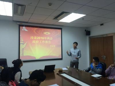为加深同学们对两会精神的理解,端正同学们的态度与思想,从而使今后的党务工作更加顺利的开展,行政学院2014级本科生党支部于4月1日12:10在前卫南区东荣大厦1202会议室举办了“两会精神”分享会。全体2014级党员和入党积极分子参加了此次会议。