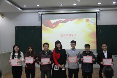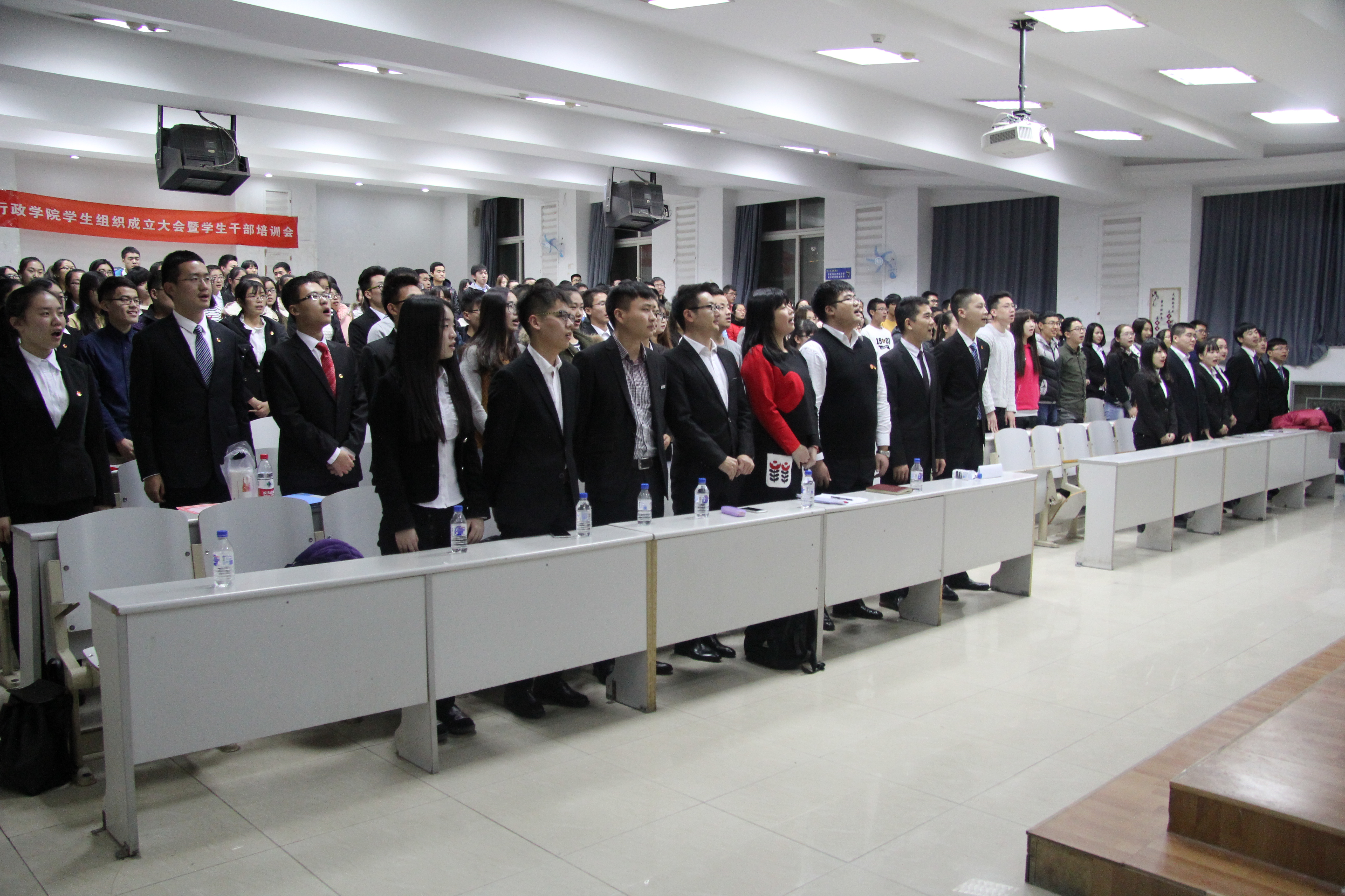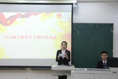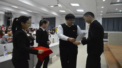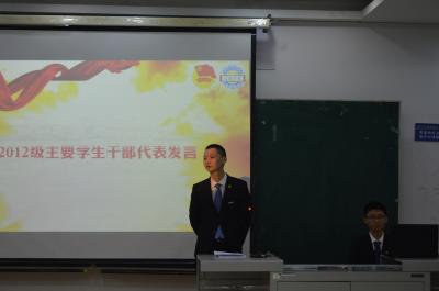 大会于18时30分开始,主持人先介绍了应邀出席本次活动的各位嘉宾,随后宣布本次大会正式开始。首先是大会第一项,全体参会成员起立合唱beat365体育官网校歌;紧接着进行的大会第二项则是由曲畅竹分别宣读公司员工干部、单项奖学金获奖者、2015级各班班委成员以及学院所属各社团负责人等同学的名单。在大会第三项的进程中,分别由两位不同年级的员工干部代表进行了发言。首先,原团委副书记姚晗(2012级)在感谢学院老师的培养和同学们的信任的同时,结合自身在校经历与生活,向在座同学分享了他所理解的老员工应具有的素质和使命。他提到,当代老员工必须树立责任意识与奋斗意识,在建立更高维度的统筹思维能力的同时,要把握高速发展的社会环境所提供的发展机遇,在老员工活的平台中发挥自己的才能,坚持到底、永不言弃。随后,员工会主席王雨萍(2013级)结合学院实际提出了一名合格的员工干部应具备的条件。她谈到,员工干部应首先明确自身工作性质的定位,树立在工作中的服务意识和公仆意识,并时刻发挥好学习工作等领域的模范带头作用,为学院的工作保驾护航。两位代表发言后,大会第四项随即开始。首先刘洋、曲畅竹与2012、2013级主要员工干部进行了本学年员工组织的授旗仪式;而后刘洋为2013级主要员工干部颁发任职证书,曲畅竹为院级优秀员工干部、单项奖学金获得者、2015级各班班委以及2014级学院社团负责人颁发荣誉证书。最后,大会第五项,全体参会成员起立合唱了共青团团歌。