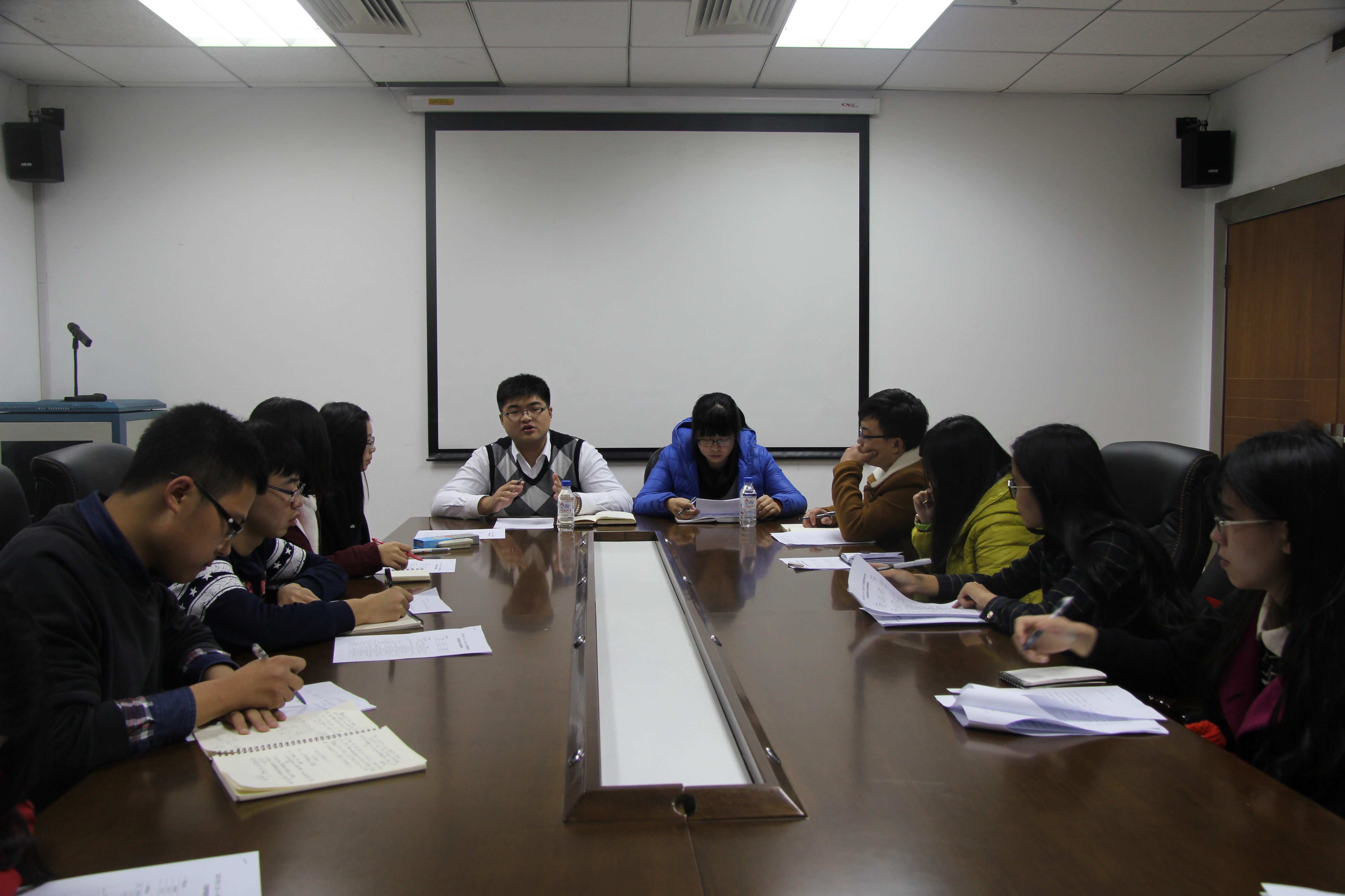 下午5时10分,会议正式开始。大会分六项进行。会议第一项:团委秘书长李代霓(2013级)详细地介绍本年度团委的工作推进,使每一位团委工作人员对自己的工作有了更深入的了解。会议第二项:团委副书记孙超群(2013级)汇报团委的整体团务工作,着重讲述了团委工作的进展、方向以及对团务工作的反思。会议第三项:社团团总支书记孟祥铎(2013级)汇报具体的各社团的团务工作,并提出了要加强团支部建设的要求。会议第四项:各年级团支书代表汇报本年级的团务工作。会议第五项: 本科生辅导员刘洋组织大家讨论工作推进表具体事宜。与会人员对团务工作进行了积极的讨论,指出了工作推进表存在的问题,进一步完善了工作推进表。会议第六项: 会议总结。本科生辅导员刘洋对上个月团委的工作成果提出了表扬与肯定,并对日后团务工作提出要求。