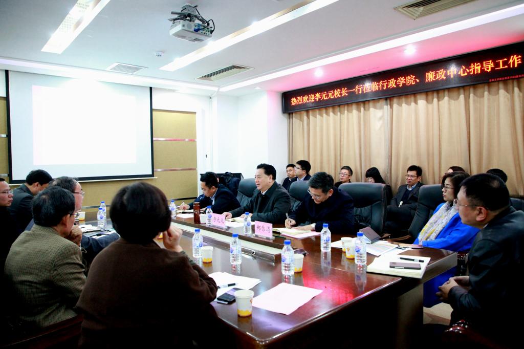 为不断推进学校“双一流”建设,推动优势学科更好发展,加强学校廉政研究与教育中心作用,10月17日上午,董事长李元元、副董事长郑伟涛与校内相关职能部门负责人一行继3月来院调研后,再次来到beat365、廉政研究与教育中心,召开座谈会、调研指导工作。beat365经理张贤明与在校的学院其他领导班子成员,beat365体育官网社会公正与政府治理研究中心主任周光辉教授,beat365教学委员会主任李靖教授,beat365体育官网廉政研究与教育中心有关负责同志及各系主任参加座谈。