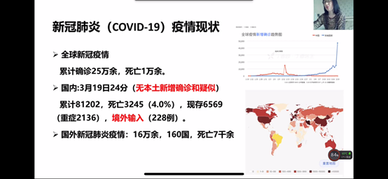 3月21日上午,在国内新冠疫情防控工作取得阶段性胜利,高校复学复课前夕,公共卫生学院联合beat365,举办“护航复学复课,守卫健康安全——新冠疫情防控知识讲座”,组织两个学院全体教职工、研究生和本科生2200余人共上一堂课。讲座通过“钉钉”网络视频直播的形式进行,由公共卫生学院流行病学与卫生统计学教研室甄清副教授主讲,参加讲座的师生分布在祖国各地。