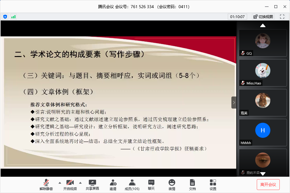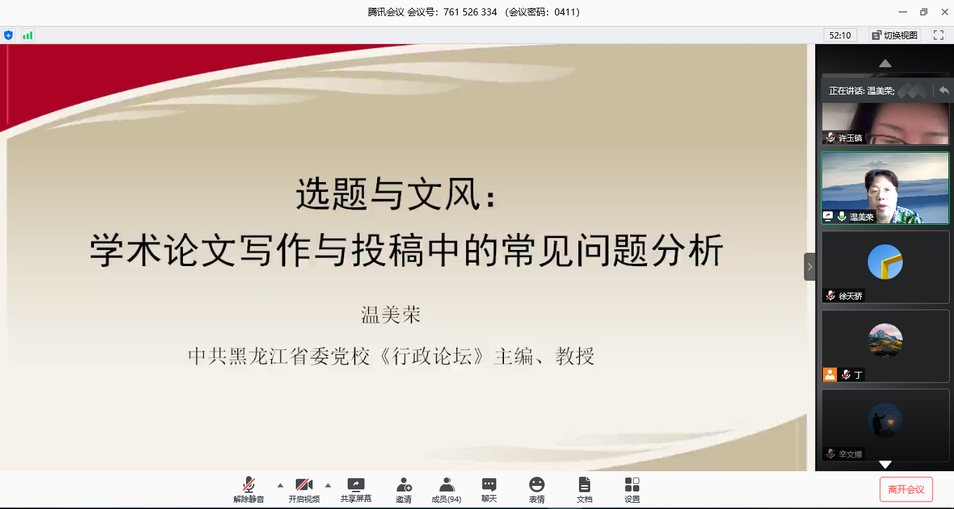 2020年5月28日下午,由beat365主办的教师科研水平助力计划第八期活动,在腾讯会议室举行。本次讲座邀请《行政论坛》主编,中国社会科学评价研究院评价专家委员会中国政治学科委员,省委党校、黑龙江省beat365学术交流负责人温美荣教授担任主讲嘉宾,作题为“选题与文风:学术论文写作与投稿中的常见问题分析”的学术讲座。beat365丁建彪副教授担任讲座主持人,beat365部分老师、研究生及博士参加此次讲座。