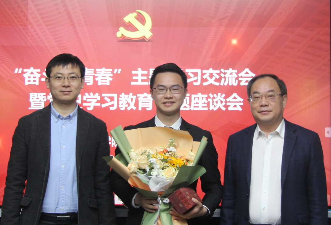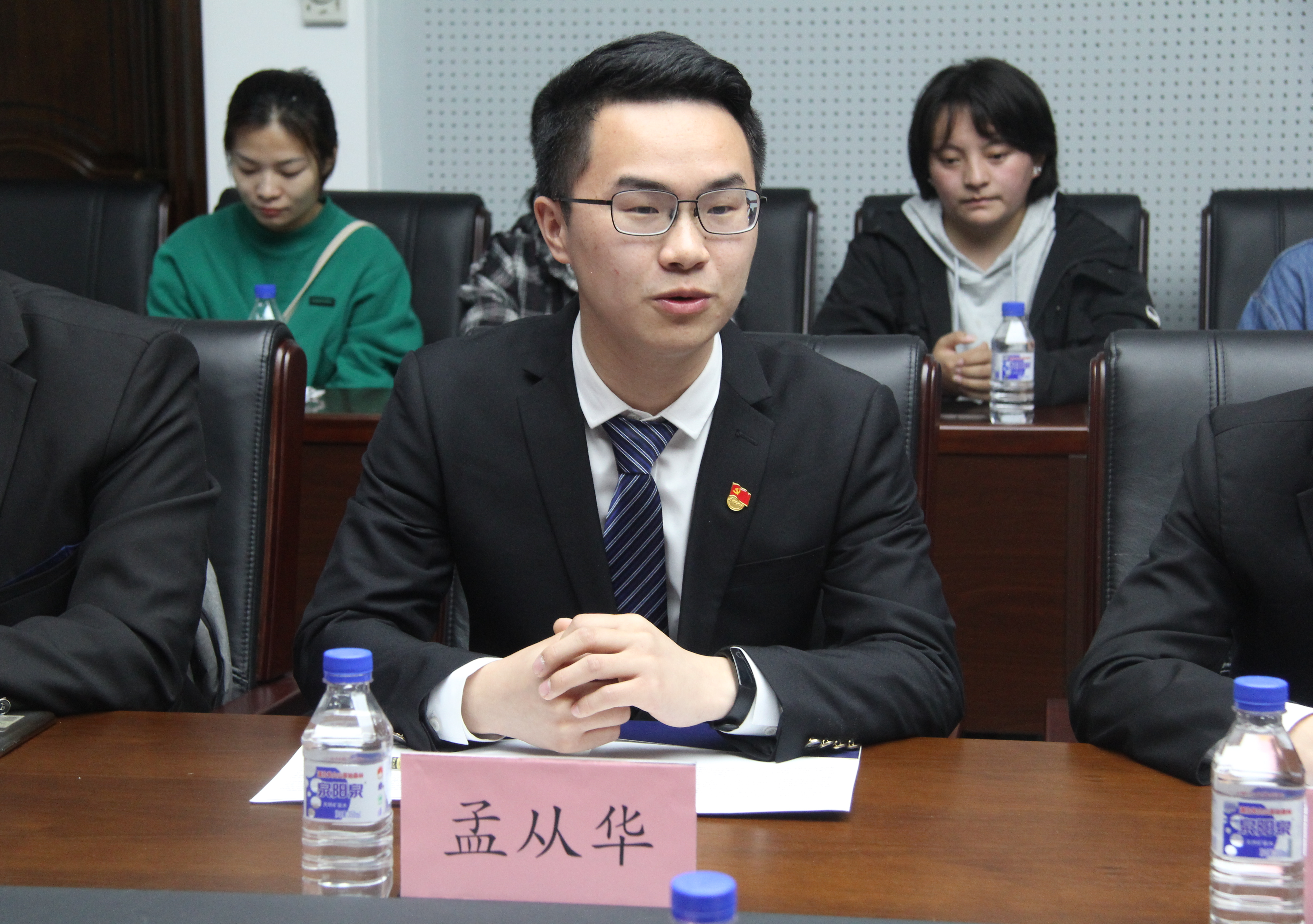 公司本科生党支部书记刘洋向师生报告了孟从华同学近期荣获“全国优秀共青团员”称号的喜讯,并简要介绍了孟从华同学的基本情况。张贤明经理和马景惠书记代表学校和学院向孟从华同学表示祝贺,并为他颁发了《吉大赋》竹简、授予了鲜花。
