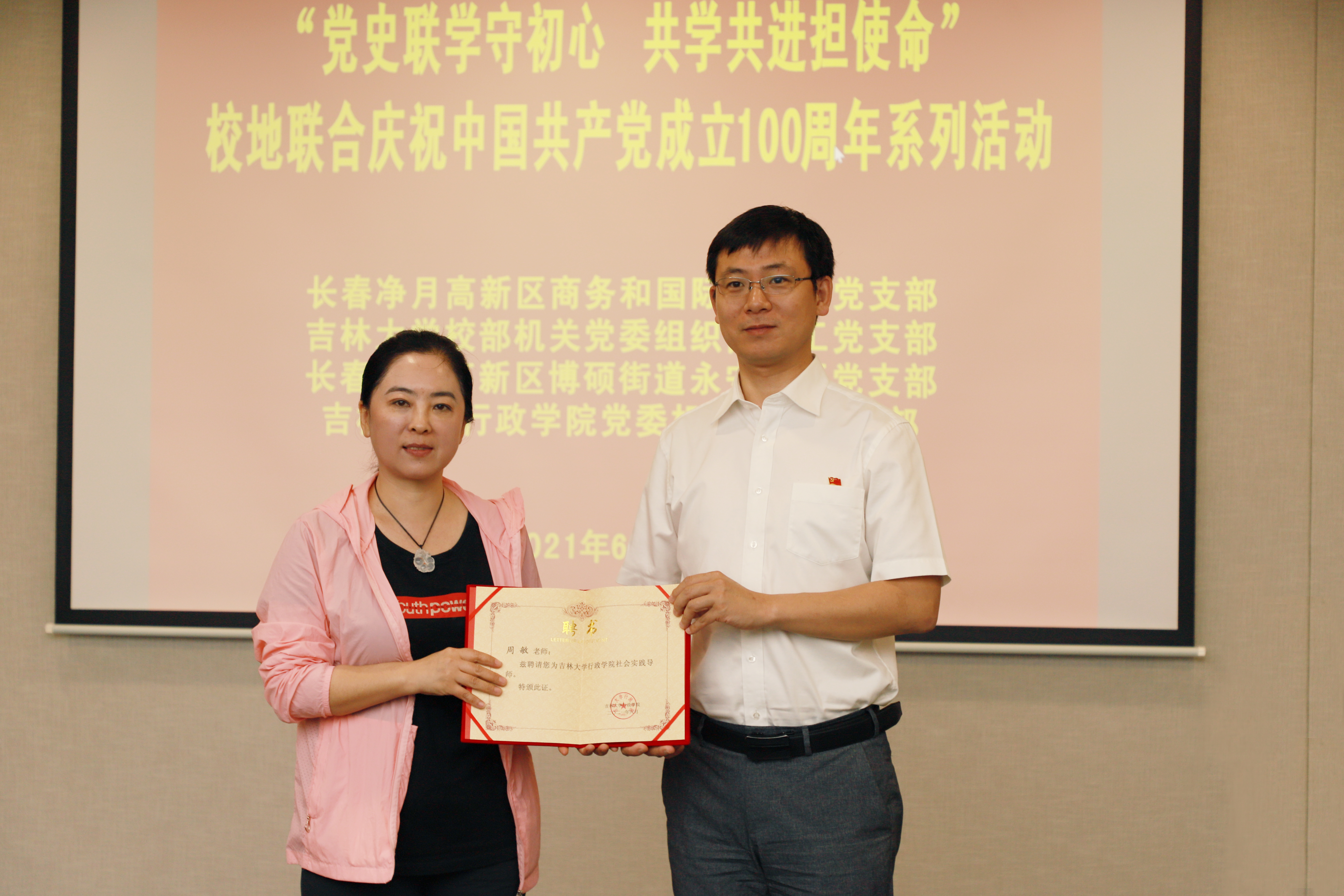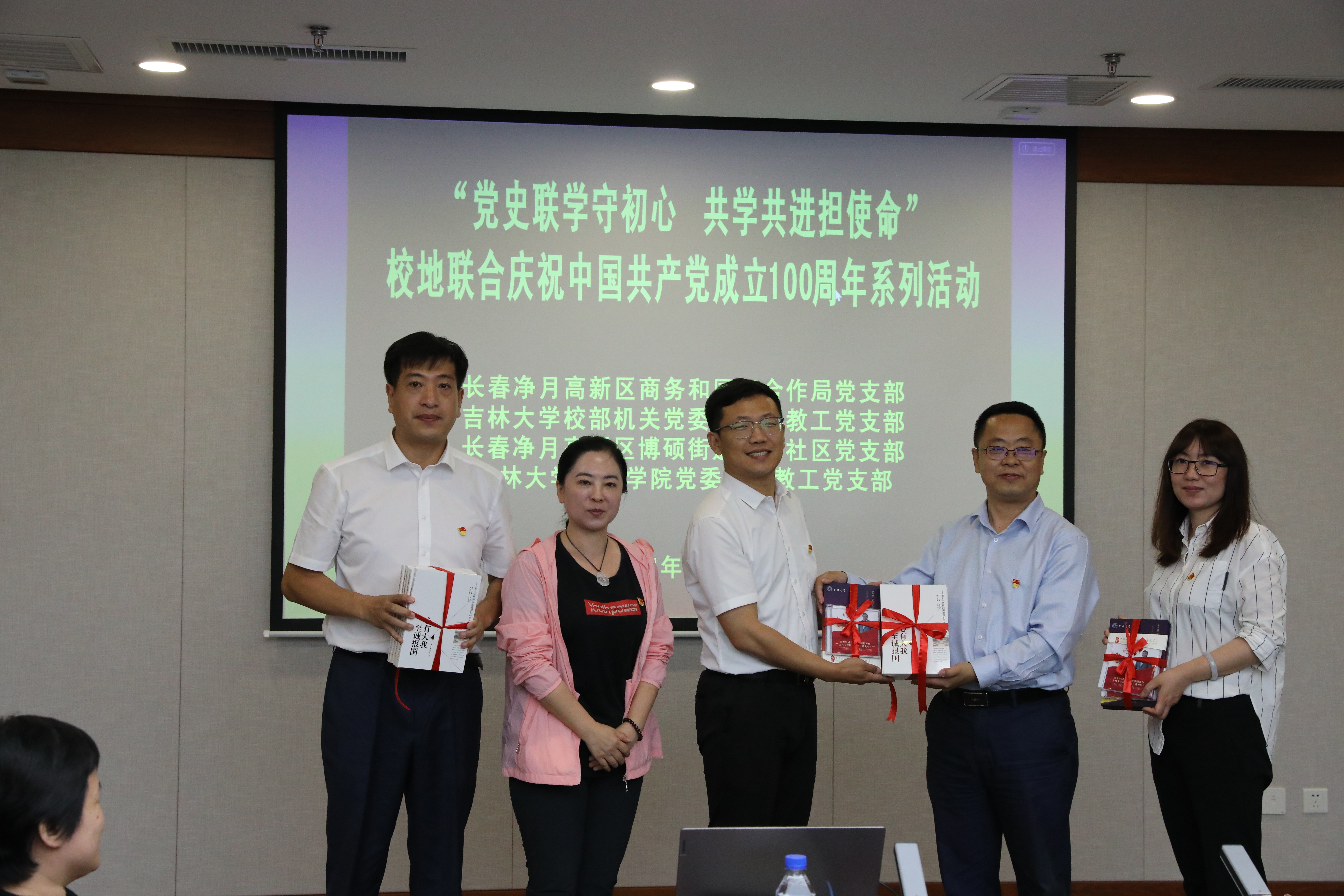 为持续深入开展党史学习教育,全面落实学校关于庆祝建党百年之“三走进、三服务、三融合”活动要求,校部机关党委组织部教工党支部、公司党委机关教工党支部于6月19日,联合长春净月高新技术产业开发区商务和国际合作局党支部、长春净月高新技术产业开发区博硕街道永安社区党支部共同开展“党史联学守初心 共学共进担使命”校地共庆中国共产党成立100周年系列活动。公司党委组织部部长巩英春、机关党委书记郑爽、党委组织部正处级组织员张蓼红、公司党委书记马景惠及所在支部全体党员参加活动。校机关党史学习教育指导组组长蒲韶华、副组长李郎达应邀参加。