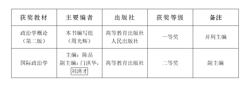 近日,国家教材委员会发布了首届全国教材建设奖奖励决定,beat365体育官网共有15项教材获评全国优秀教材(含参与编著)。其中,由公司周光辉老师主编的《政治学概论》与刘清才老师(已故)作为首席专家参编的《国际政治学》分获首届国家教材建设奖一、二等奖。