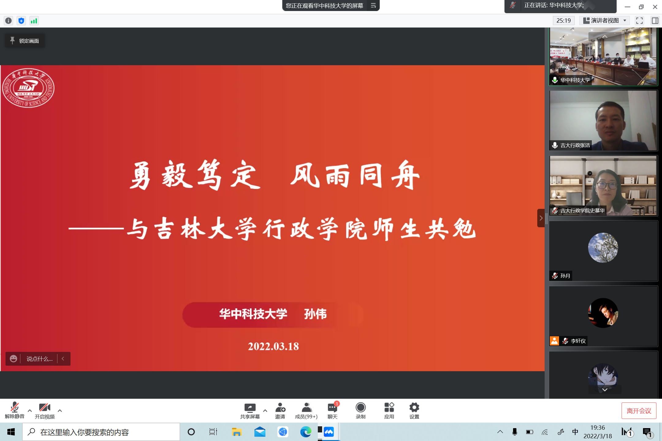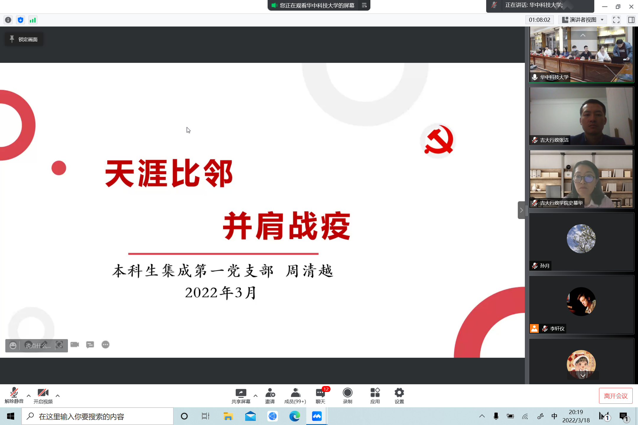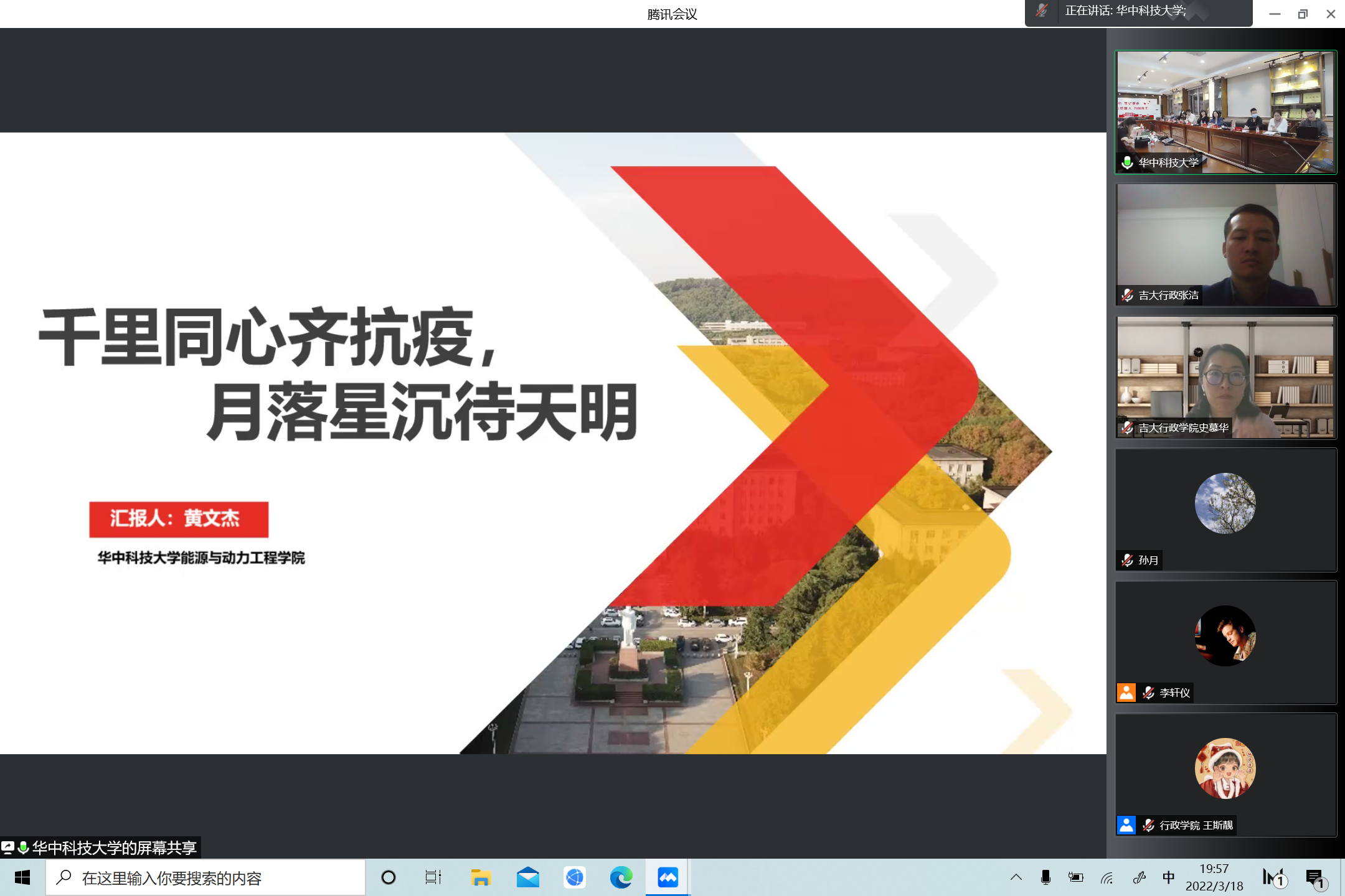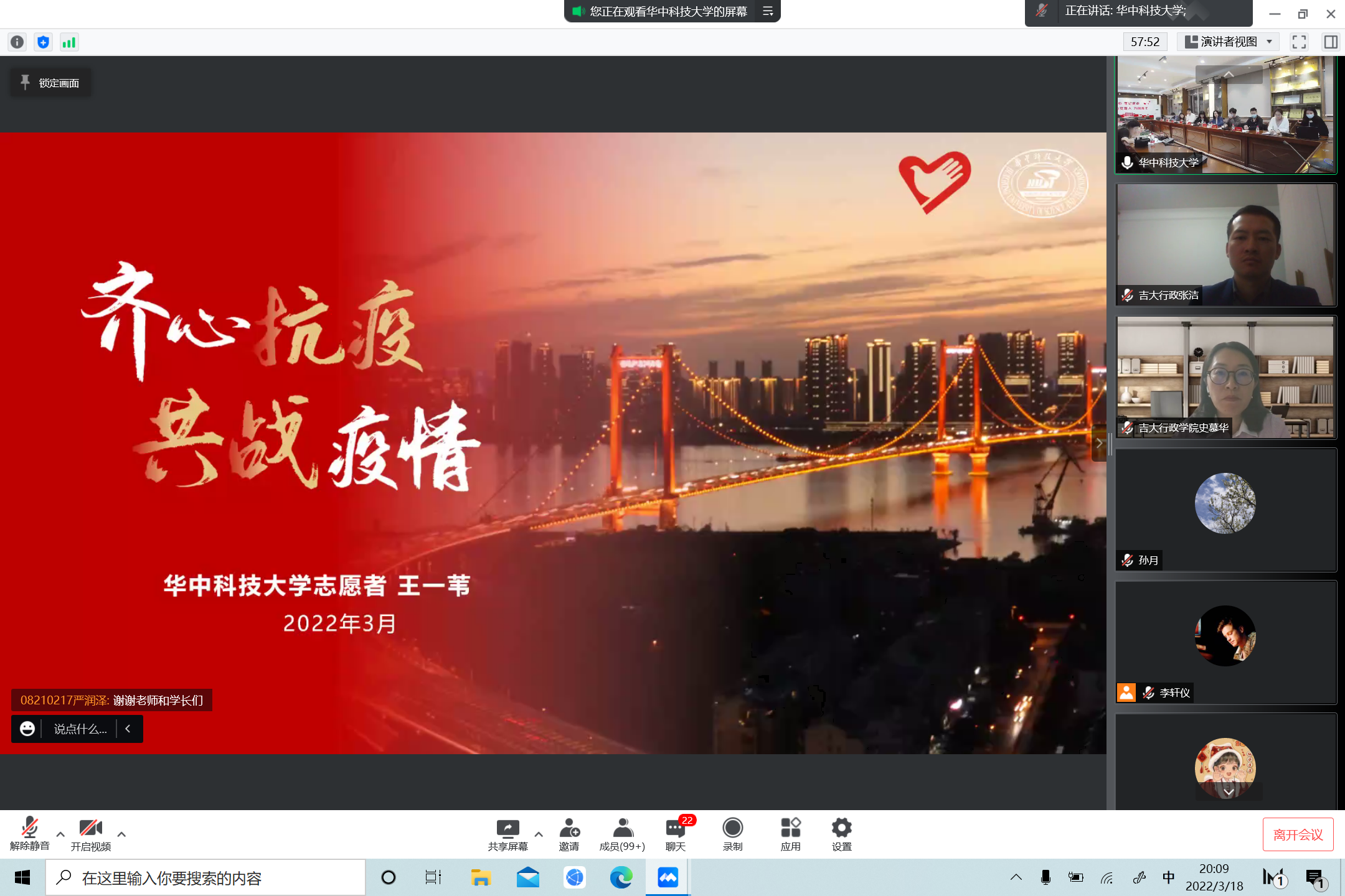 会上,华中科技大学师生代表从多个角度依次为beat365分享抗疫心得。能源与动力工程学院辅导员孙伟从“初心导思”“齐心导航”“细心导学”三方面分享了停课不停学工作经验,强调思想教育、线上活动、坚定信心的重要意义;建筑与城市规划学院辅导员杨柳讲述了网络战疫的自身经历,感慨在特殊时期辅导员更应化身员工们的守护者与主心骨;土木与水利工程学院辅导员张誉千介绍了寝室封闭期间华中老员工参与求职就业、论文写作、考研复试的创新模式;能源与动力工程学院2018级本科生黄文杰回顾了他的《守望天明》等原创战疫MV的创作历程;新闻与信息传播学院2020级硕士研究生王一苇分享了三次投身抗疫志愿服务、参加新冠肺炎疫苗临床试验的切身体会;电气与电子工程学院2018级本科卓越实验班班长韩东润分享了团结同学、相互监督,保证线上学习效率和质量的做法;光学与电子信息学院本科生集成第一党支部副书记周清越分享了党支部云端筑牢战斗堡垒、发挥党员先锋引领作用的工作经验。