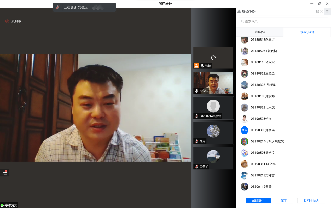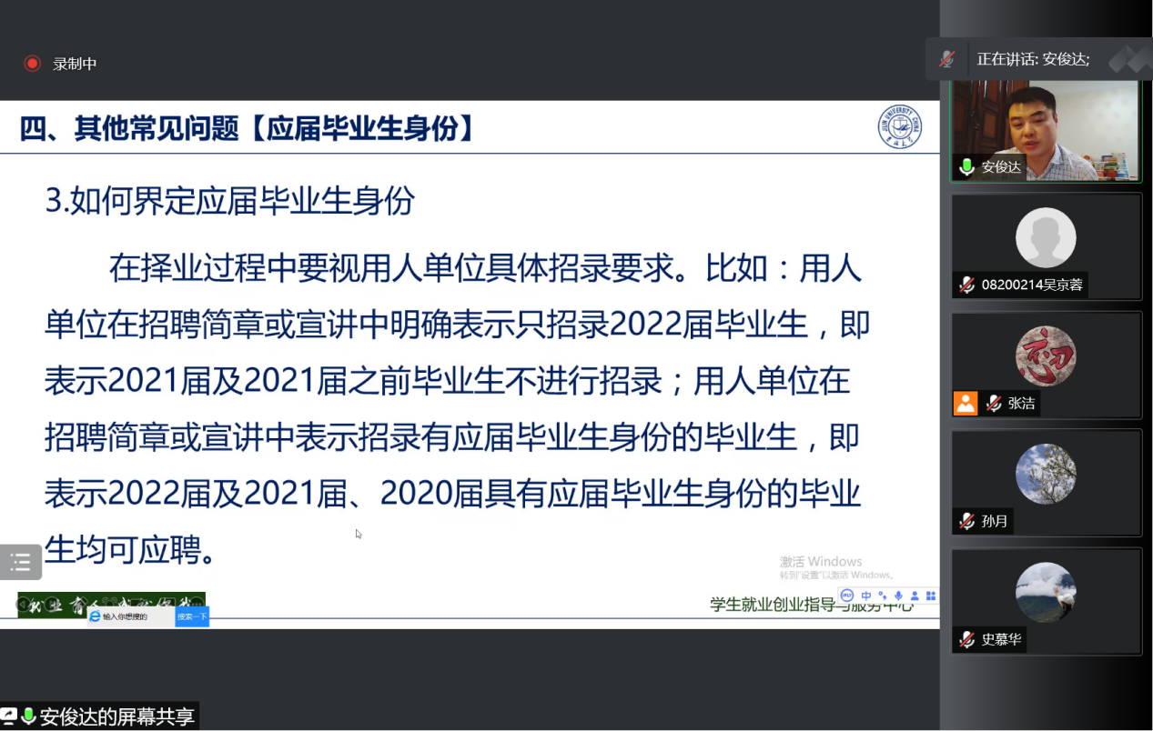 安俊达围绕就业管理政策、毕业就业流程与相关手续办理进行了解读,详细讲解了就业工作的注册和信息维护、签约和解约、派遣和改派、人事档案存取、应届毕业生身份界定、各类证明开具等常见问题及业务办理注意事项,并在线为同学们进行了就业系统的操作演示。讲述过程中安俊达老师以问题为导向有的放矢,结合个人经历鼓励同学们多关注了解就业政策与形势,适当调整心理预期,保持良好心态,尽早规划、积极就业。