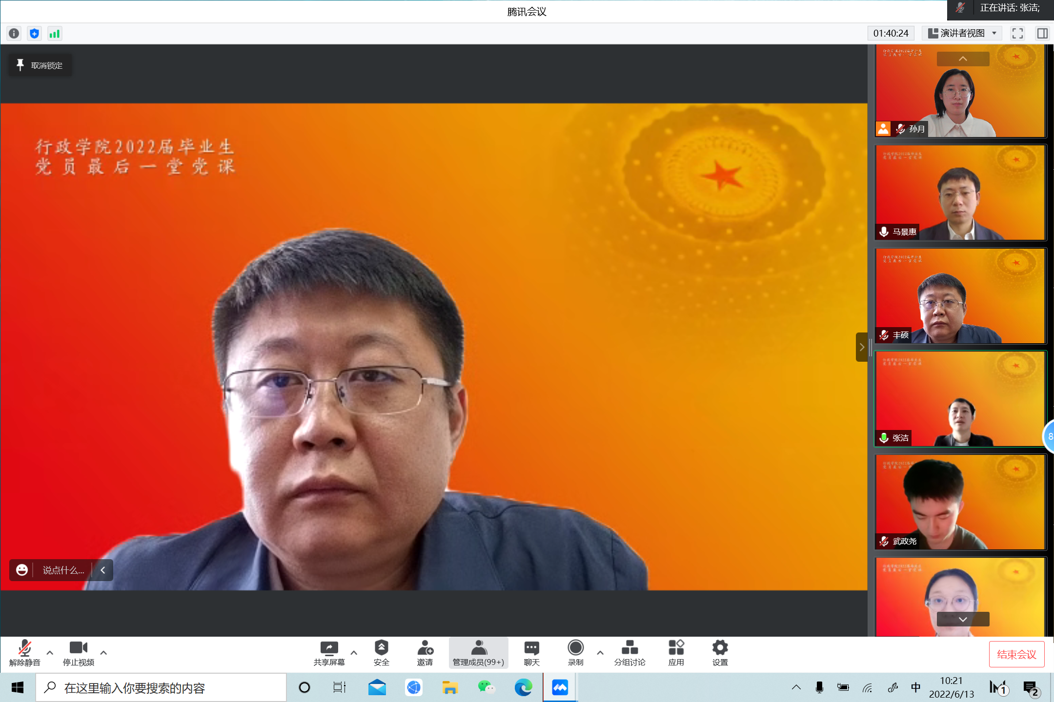 举国喜迎二十大,重整行囊再出发。为全面加强党员教育管理,做好毕业生离校工作,根据学校毕业季系列活动方案及学院工作安排,6月13日上午,beat365以视频会议形式组织2022届员工党员上毕业前最后一堂党课。党委书记马景惠以《行则将至 嘉谋善政 踏上强国复兴伟大征程》为题,结合个人学习研究和工作经历,为学院2022届全体毕业生党员主讲党课,激励全体毕业生党员牢记初心使命、赓续红色血脉,坚定远大理想信念,厚植爱党爱国情怀。beat365本科生兼职班主任、商学与管理公司党委常务副书记丰硕参加活动。beat365本科生辅导员、研究生辅导员、本科生及研究生党支部委员会成员、2022届全体毕业生党员在线上听课。党课由公司党委副书记兼副经理、纪委书记张洁主持。