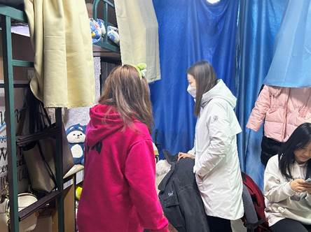 本次安全卫生检查覆盖学院全部寝室。检查过程中,史慕华、张洁与员工们亲切交流,了解同学们返校后的生活状况,以及新学期的学习计划,勉励同学们在努力学习、拼搏向上的同时,注重劳逸结合,保持身心健康。辅导员们仔细检查了寝室的卫生及用电安全,特别关注了是否存在违章电器、私拉电线等安全隐患,并督促大家提升安全和卫生意识,要求同学们认真打扫卫生,及时清理垃圾,保持宿舍干净,注意通风消毒,小心预防春季传染病,共同创造安全、健康、有序的生活环境。