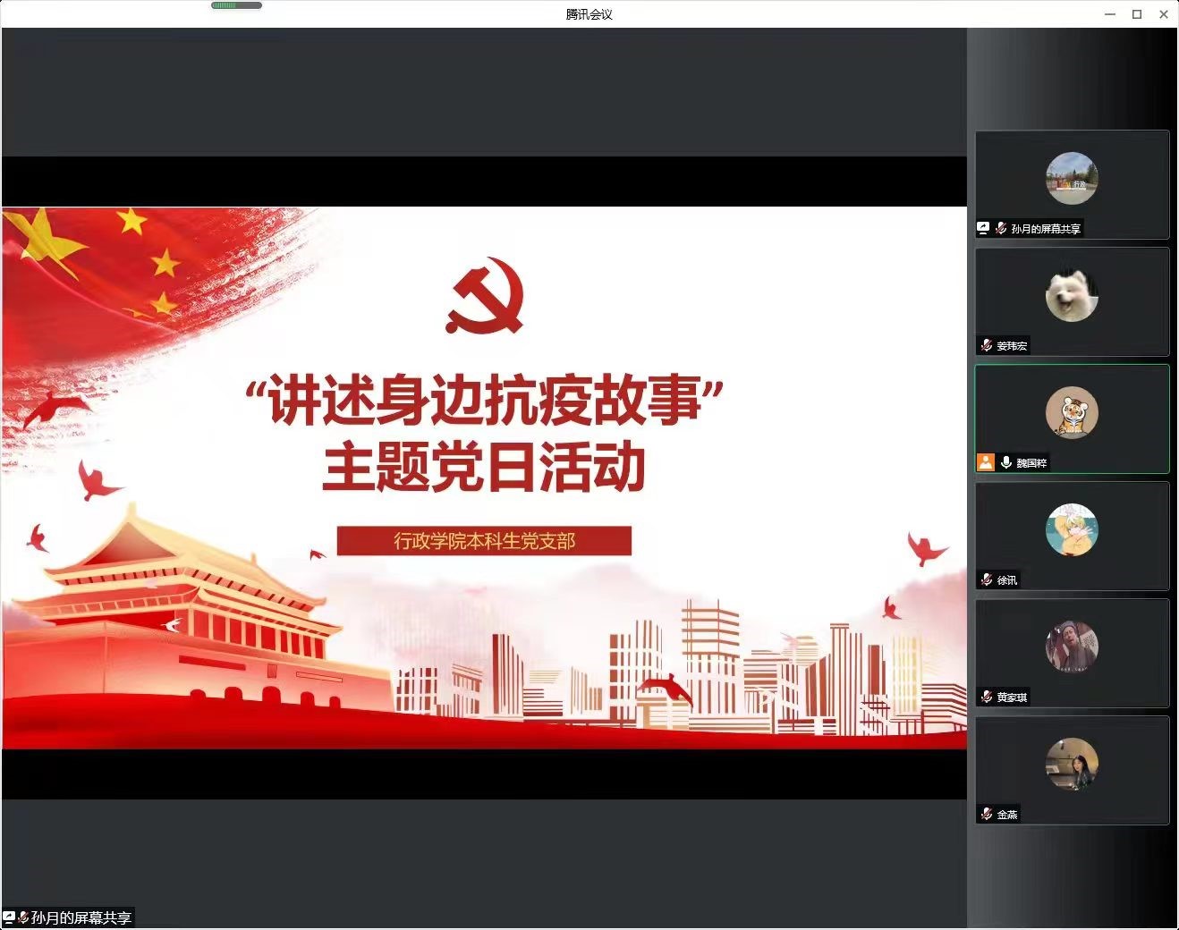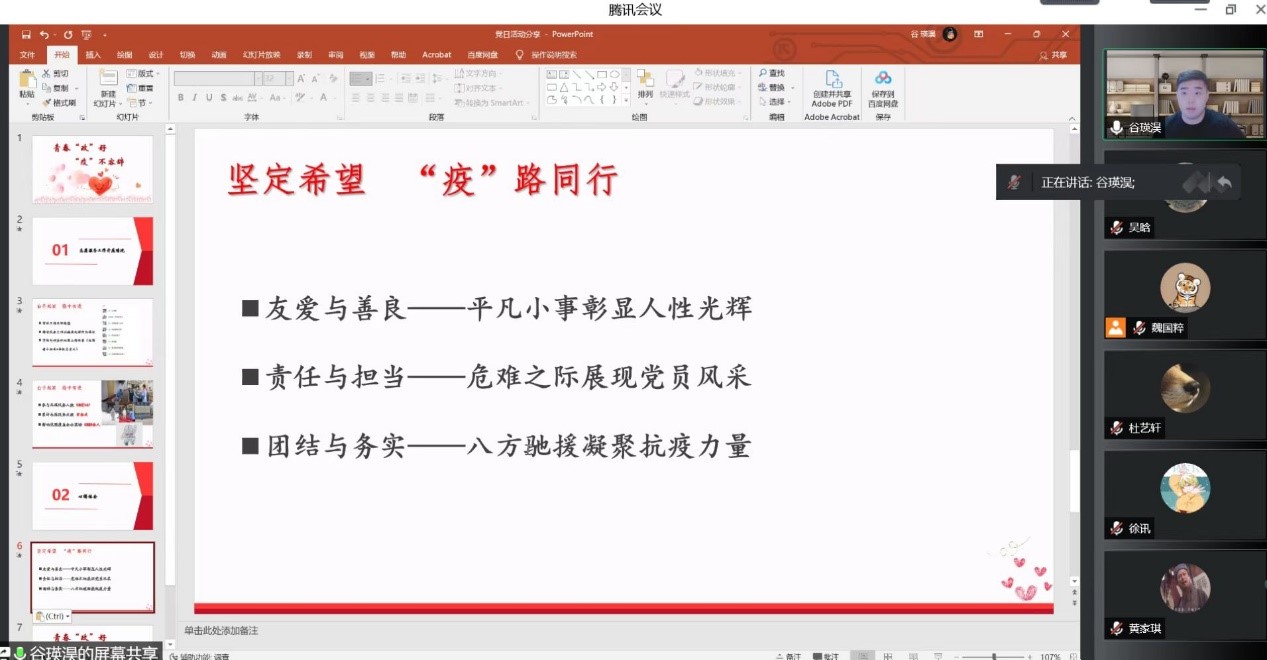 根据学校《关于组织开展“讲述身边抗疫故事”主题党日活动的通知》要求,为进一步弘扬伟大抗疫精神,宣传身边党员和师生在疫情防控工作中的先进事迹、感人故事与崇高精神,不断增强广大党员归属感、荣誉感和使命感,beat365本科生党支部于5月25日开展“讲述身边抗疫故事”主题党日活动。党支部全体党员参加活动。本次活动由支部委员魏国粹主持。
