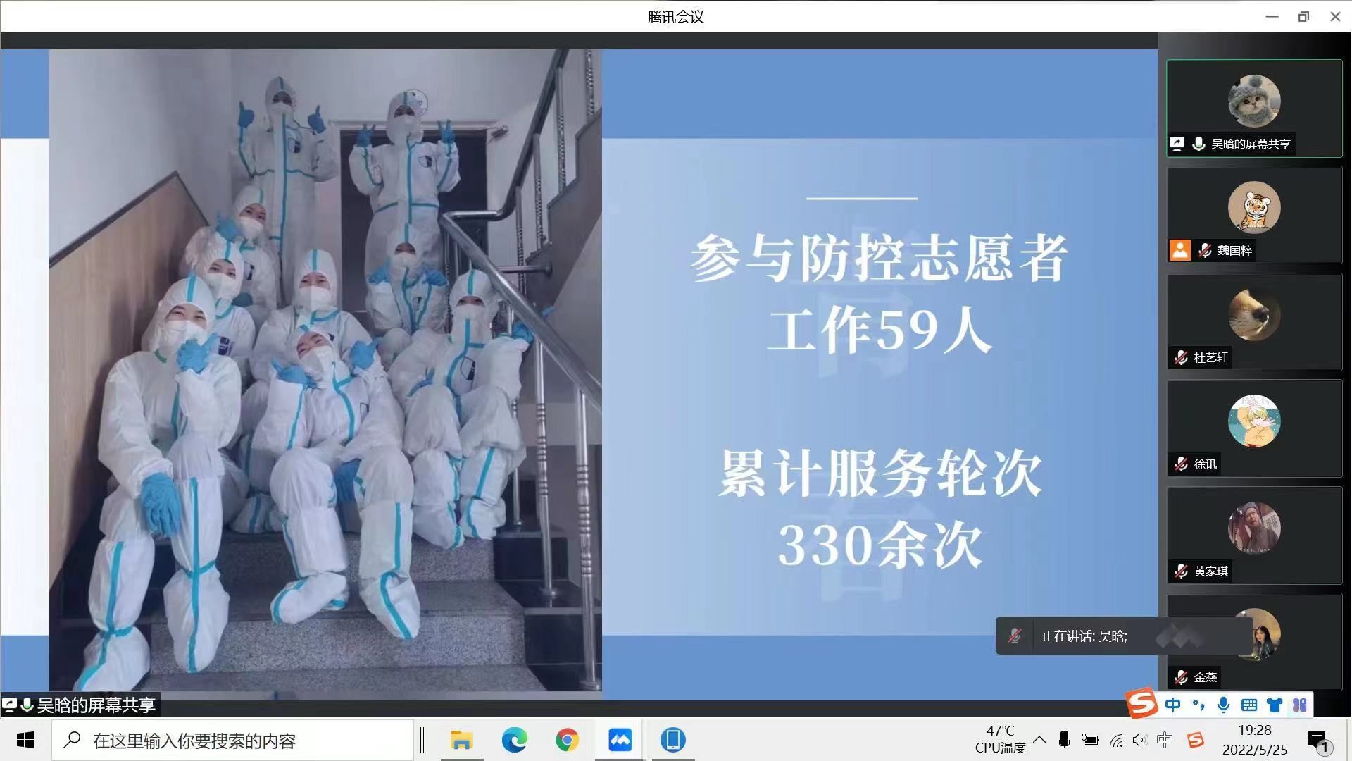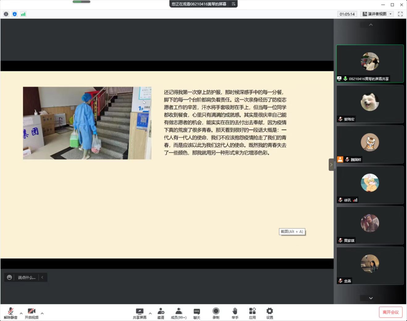 活动围绕 “讲述身边抗疫故事”进行了专题座谈,学院各本科生公寓员工志愿者负责人结合自身经历、抗疫实践、收获感受分享了心得体会。南苑1公寓志愿者负责人、2018级本科生谷瑛淏以“青春政好,疫不容辞”为主题,分享了疫情期间感受到的同学们的友爱与善良、责任与担当、团结与务实;2018级本科生金燕作为南苑9公寓年级志愿者负责人之一,结合个人经历进行了分享,体现了青年学子用志愿精神来诠释当代青年的初心与使命,万众一心、抗击疫情;南苑9公寓年级志愿者负责人、2019级本科生吴晗带领大家回顾了为期50余天的志愿服务,志愿者们无私奉献,出色地完成了各项服务工作。2020级本科生姜玮宏、李珍两位同学共同分享了南苑2公寓的抗疫故事,从日常“三餐一水”的配送,到与其他学院同学的沟通协调,后期的点位志愿者安排等,彰显了同学们众志成城、共克时艰的精神风貌。文苑2公寓志愿者负责人、2021级本科生刘祉含结合几位志愿者的典型事迹,分享了志愿者们在公寓中服务、奉献的感人瞬间;文苑3公寓志愿者负责人、2021级本科生黄琴以“文三中的我们”为题,分享了抗击疫情过程中对于beat365体育官网的每一个学子都是难忘且意义非凡的经历,总结了志愿服务中的收获。支部书记孙月进行总结,表达了对疫情期间挺身而出的志愿者们的感谢,鼓励大家向身边榜样学习,充分发挥党员的先锋模范作用。