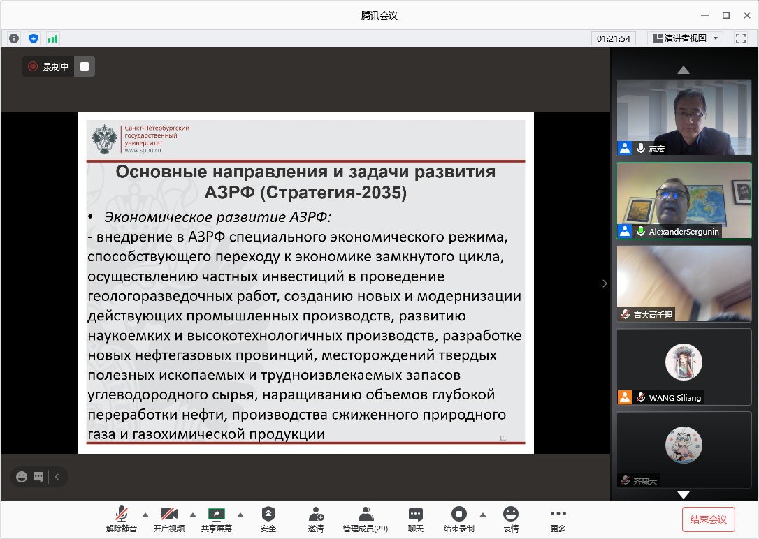 讲座伊始,谢尔古宁教授简要介绍了俄罗斯北极地区概况及新冠疫情对北极地区的影响。同俄罗斯主要城市相比,北极地区受新冠疫情影响相对较轻,但北极地区旅游业、餐饮业、教育行业、医疗资源等均受到一定冲击。受此影响,北极地区原定的企业建设、基础建设方案大多未得到实际落地。