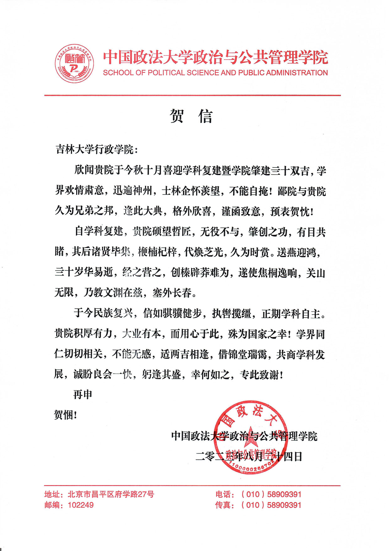 中国政法大学政治与公共管理学院的贺信