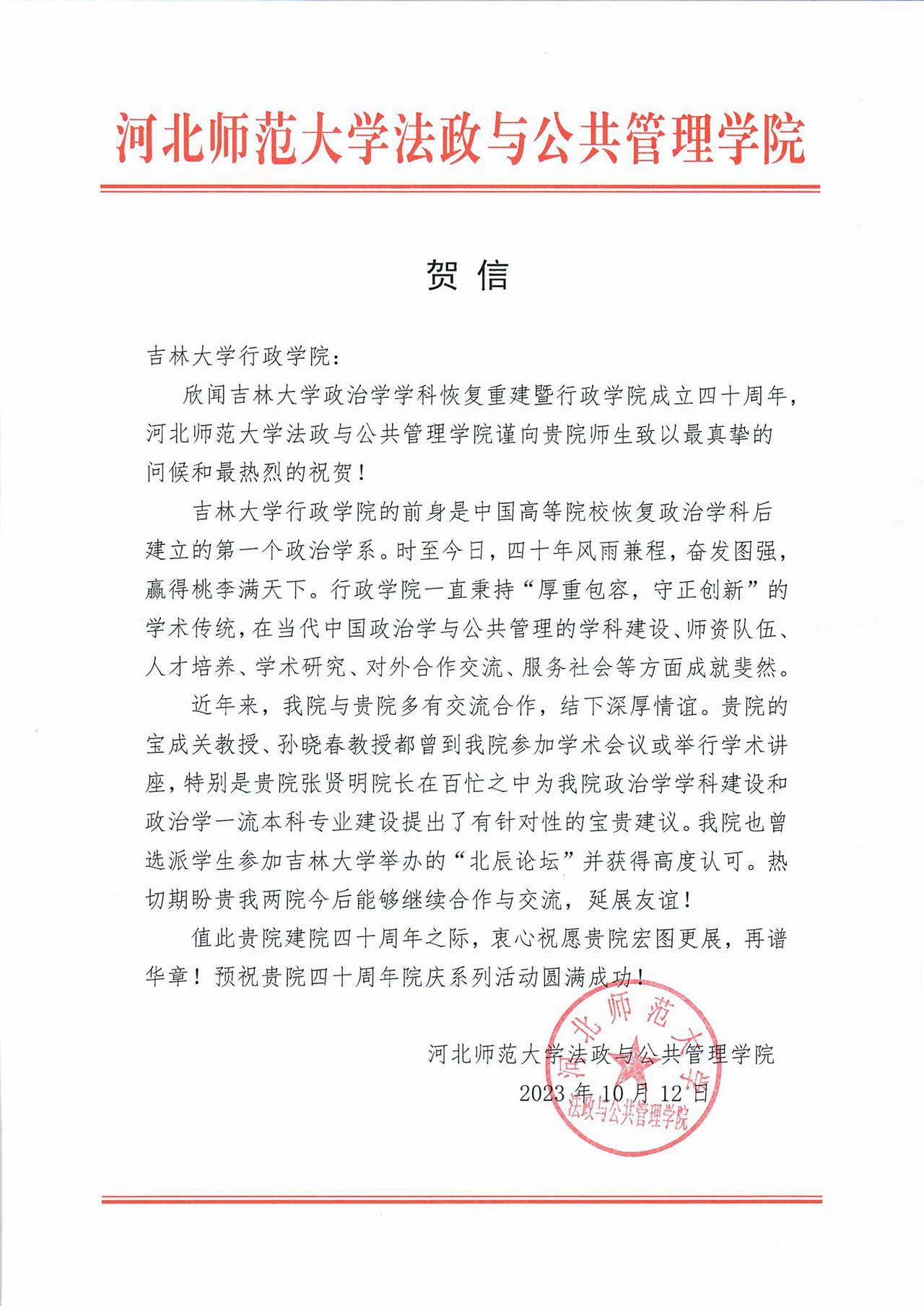 河北师范大学法政与公共管理学院的贺信