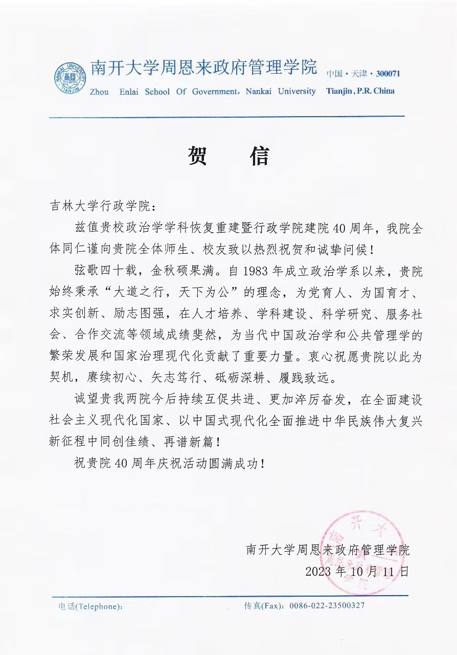 南开大学周恩来政府管理学院的贺信